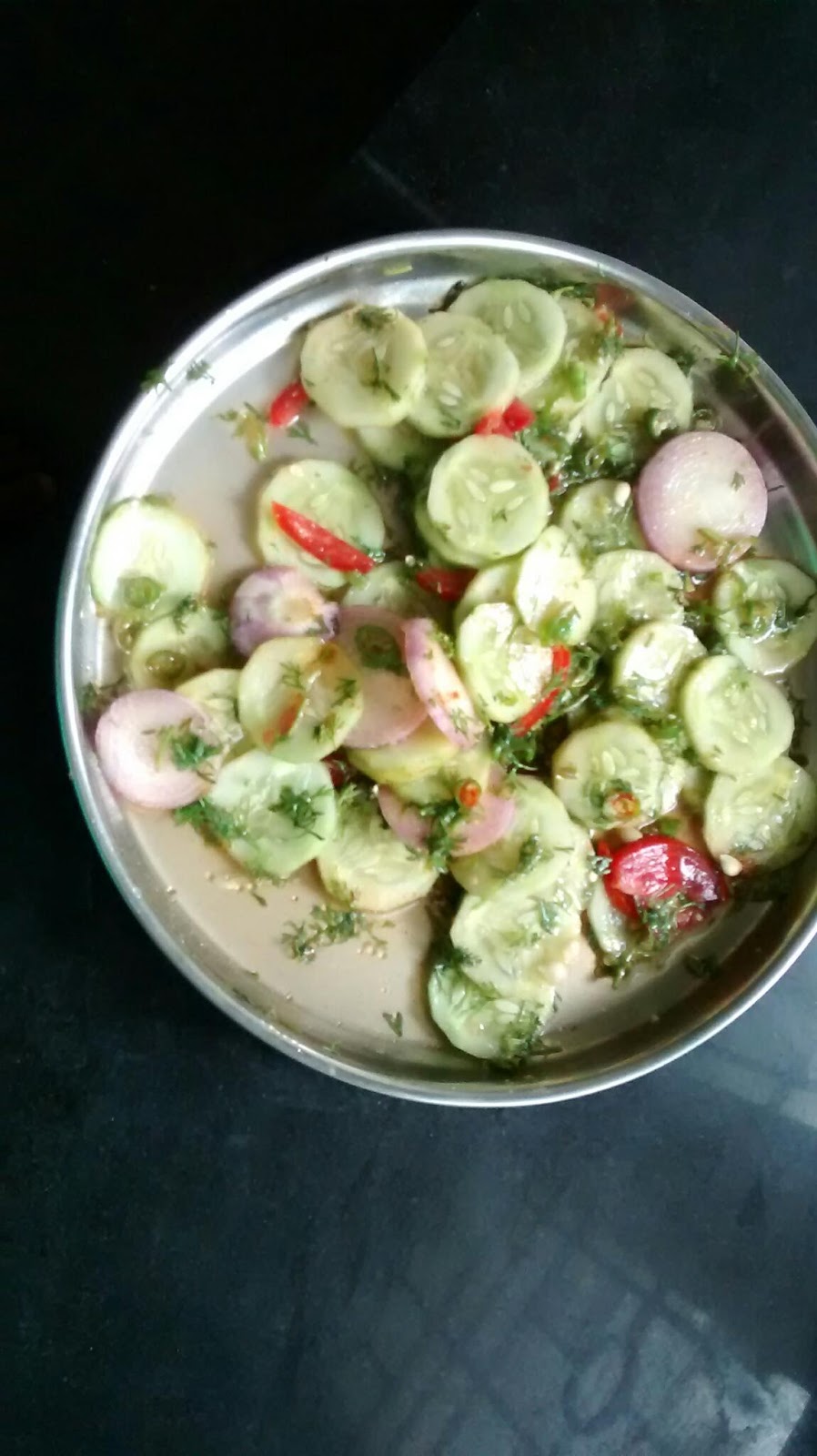 7. Then put the slices of cucumber, tomatoes and onion ring into the plate and then mix using two forks.